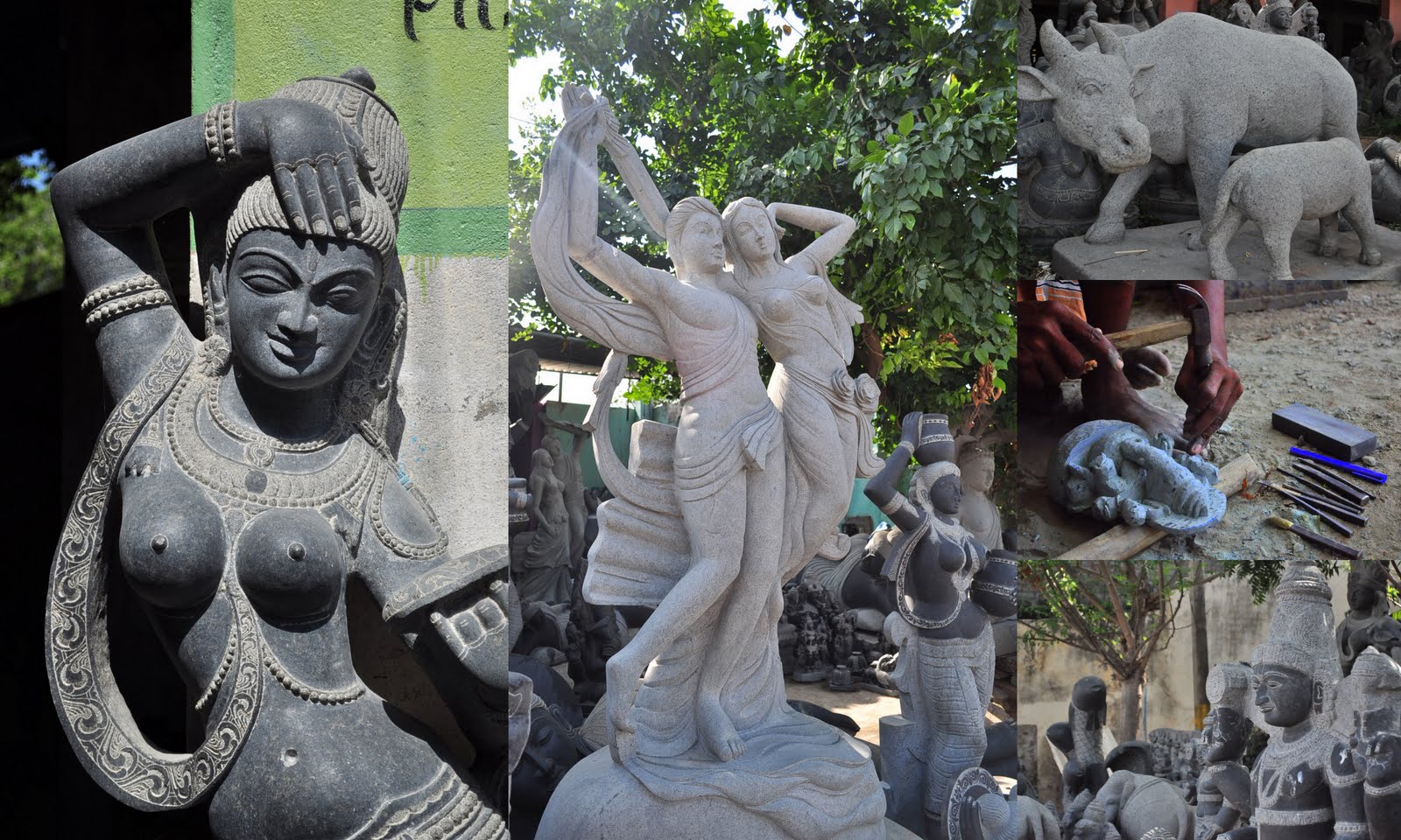 Another sculptor, Dashnamoorthy, a seasoned artist, who is an alumnus of the Government College of Architecture and Sculpture at Mamallapuram, has turned the portico of his house into a studio and shop. There he creates medium-sized stone sculptures of gods and goddesses, and sells them to tourists who saunter by.